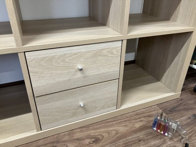 奥側の棚は引き出しと扉をつけて、変化をつけました。